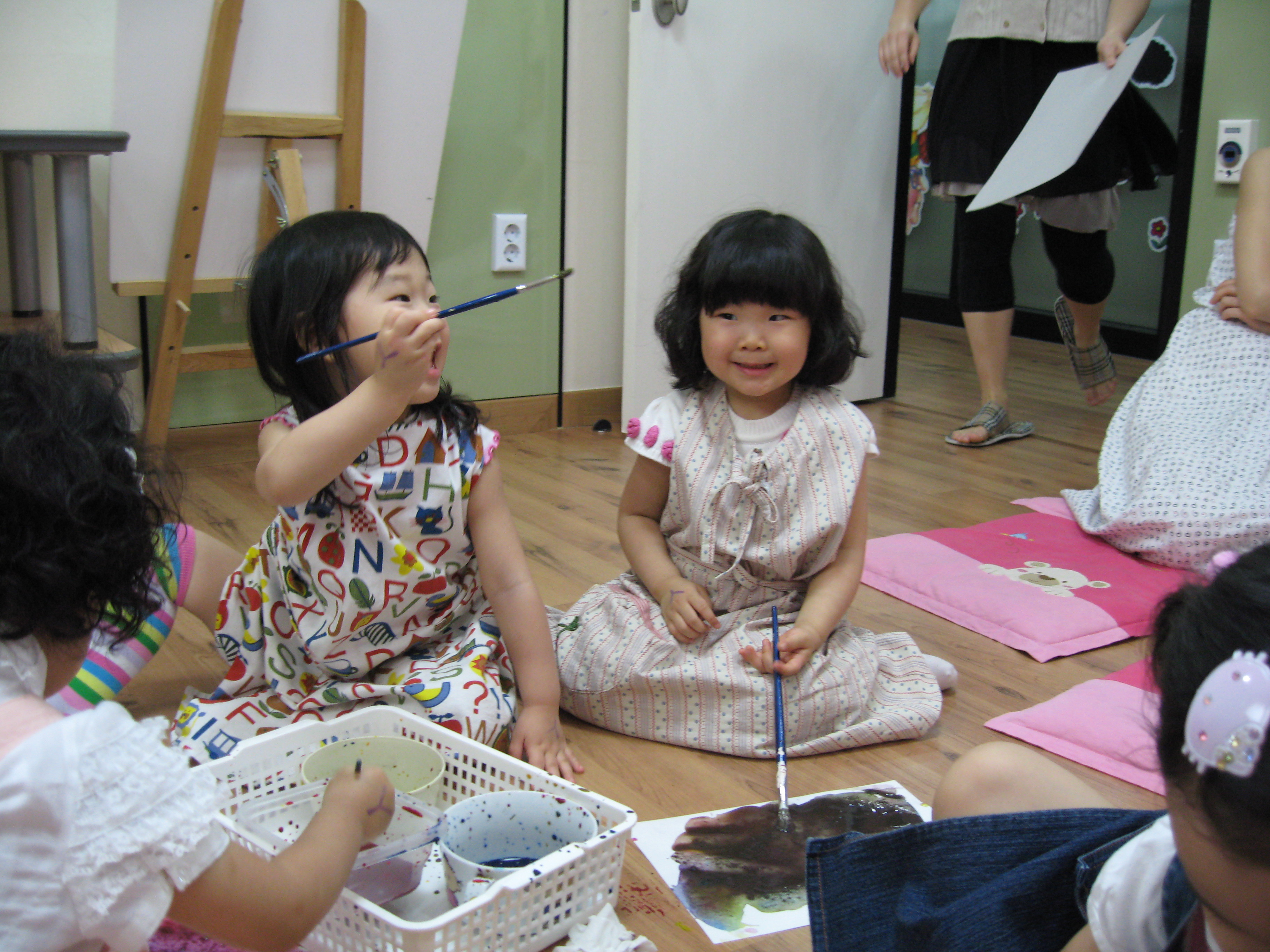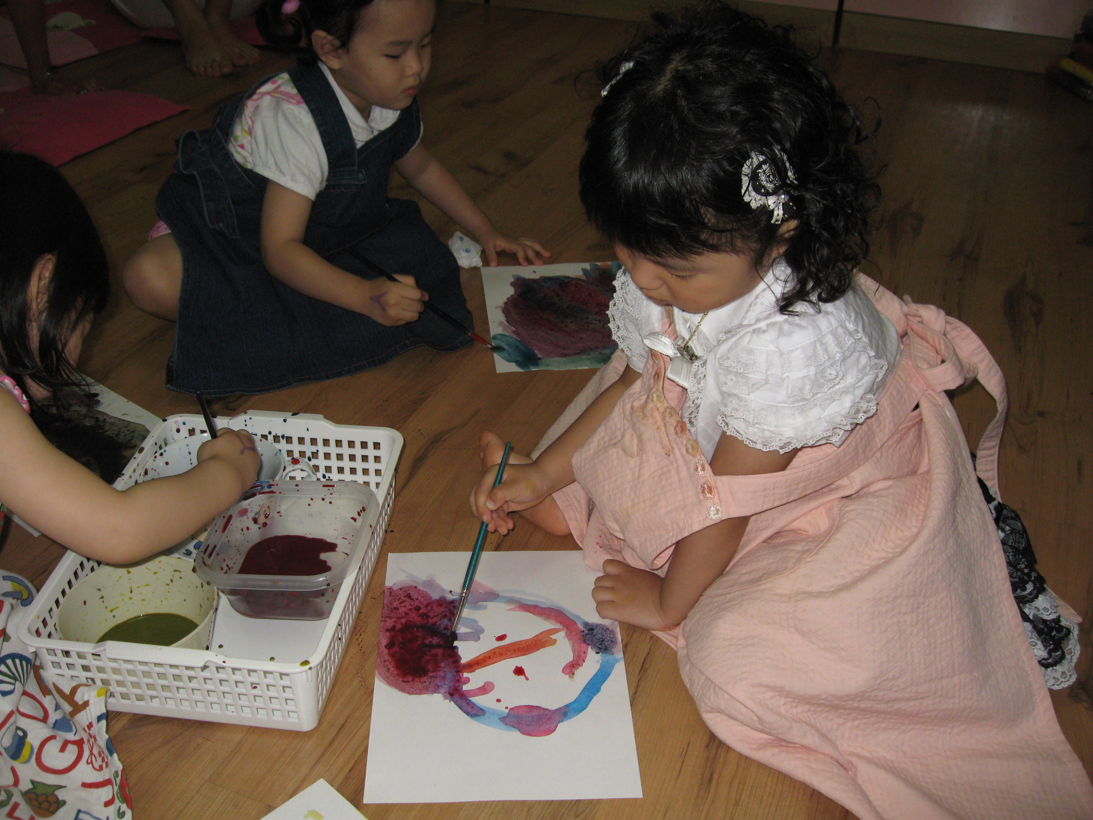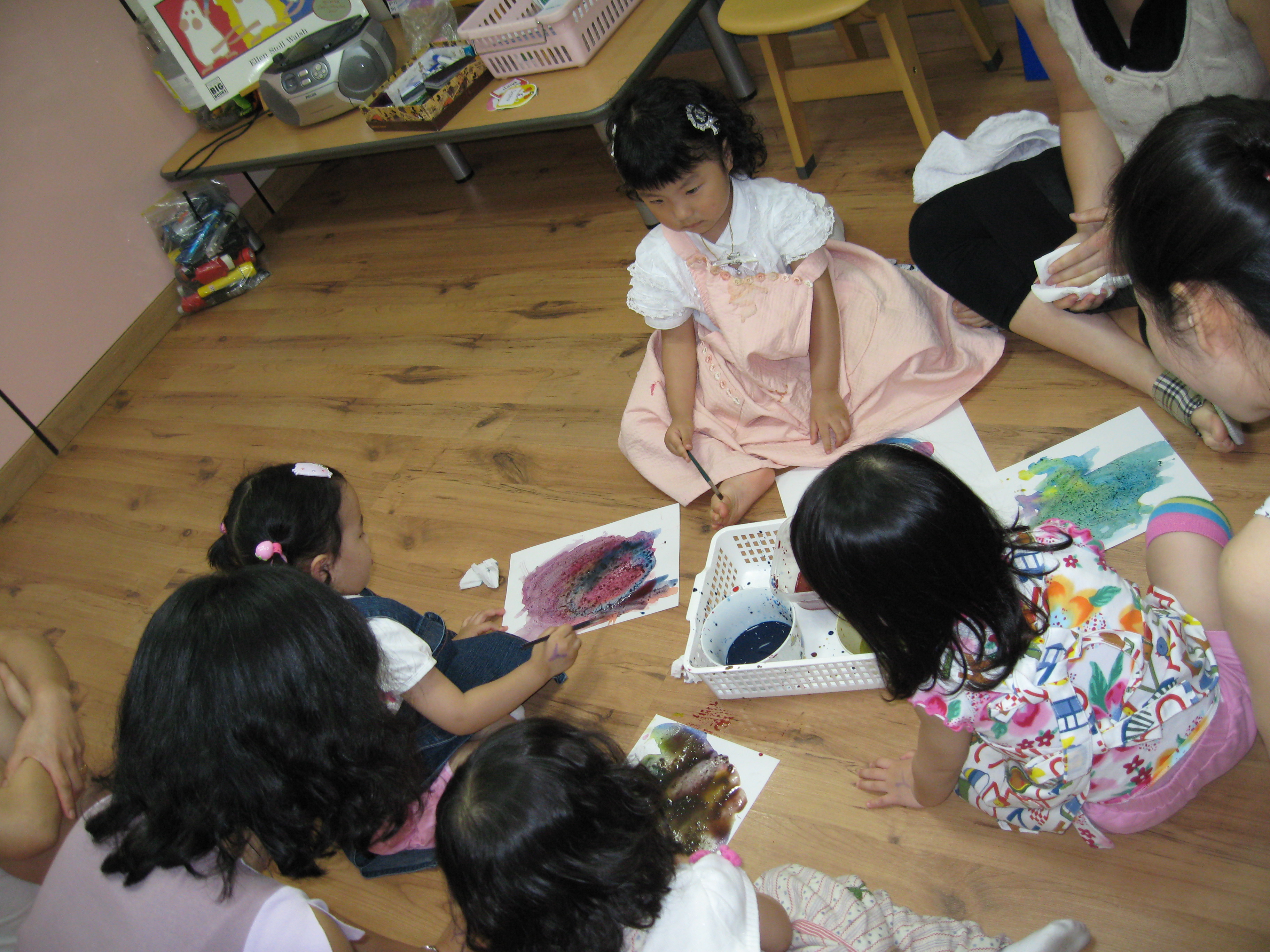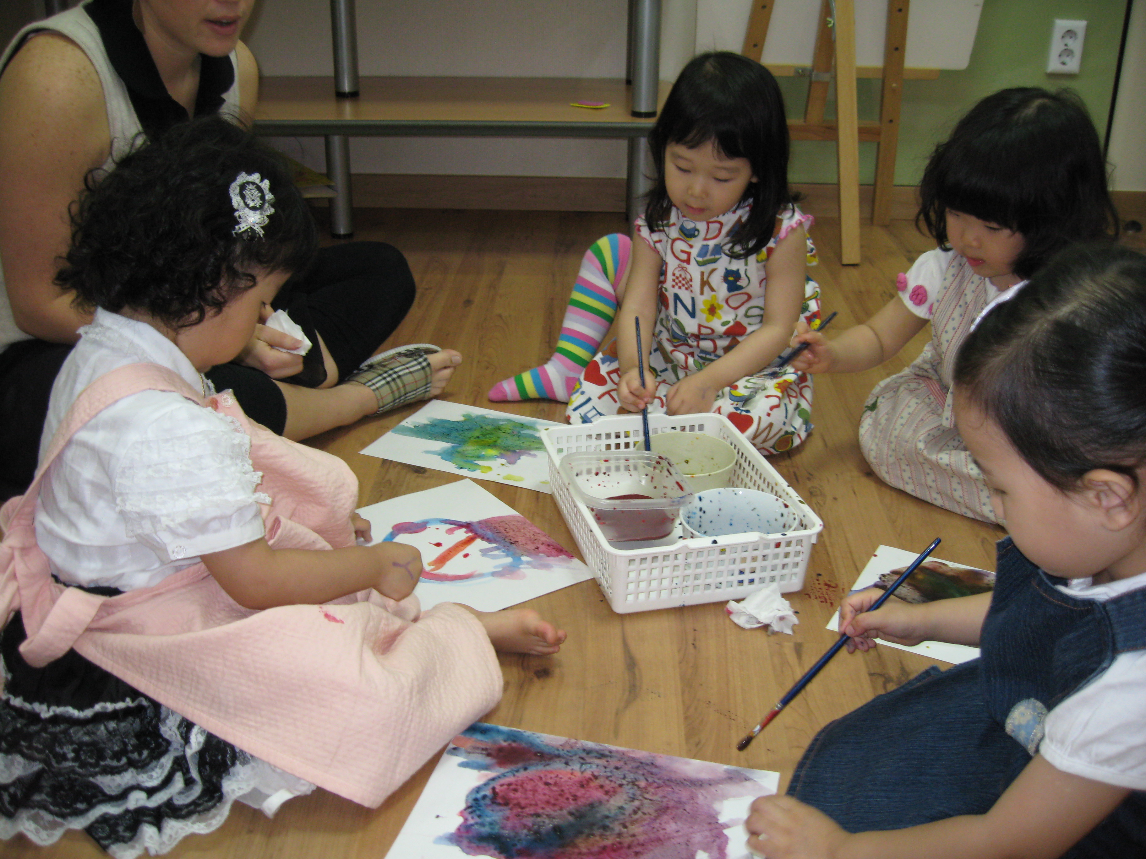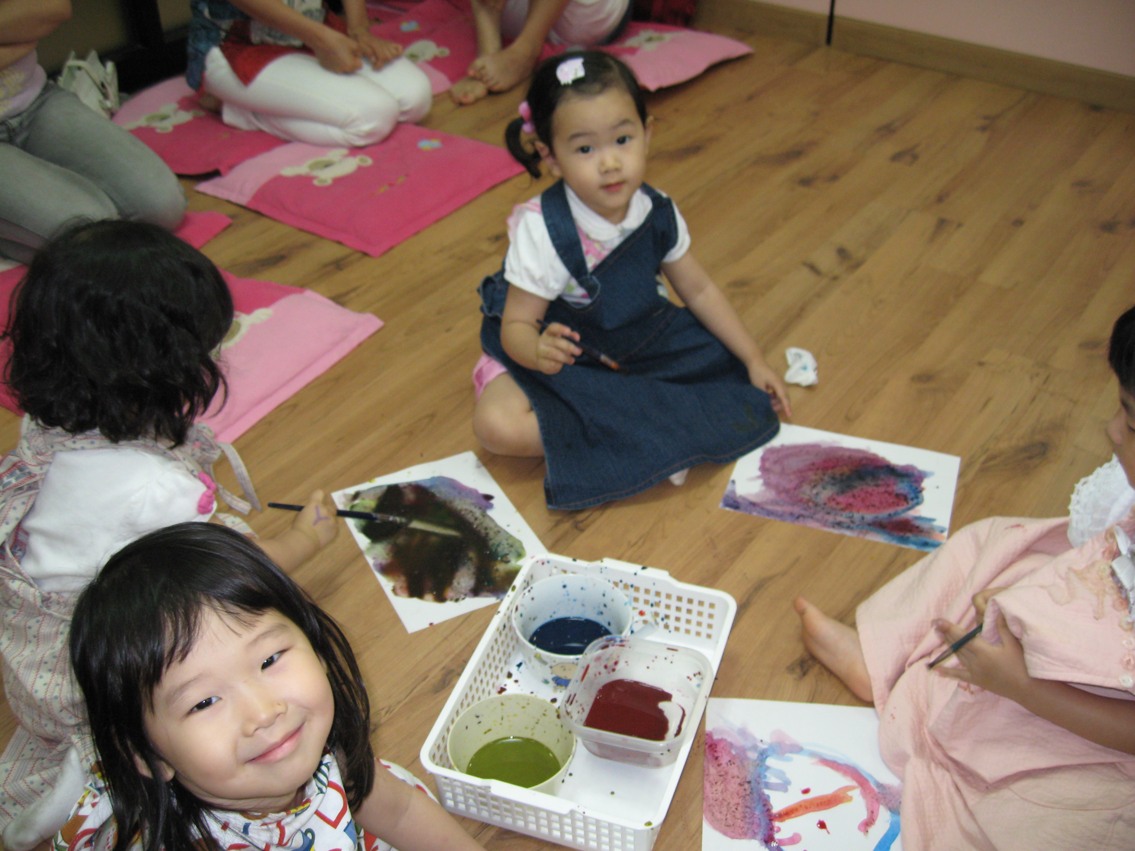 Today we learned more about colors through a book named My Crayons Talk. Blue says "swing so high", Red says "Do not go", Yellow says "Quick, baby chick". We used these colors, blue, red, and yellow, to figure out what other colors we could make like green, orange, purple and brown. Eli made a creative crocodile, pond, and chair. Minji painted a colorful rainbow. Minnie painted a lovely person on a sunny day. Sophia used green and purple to create a beautiful painting!!