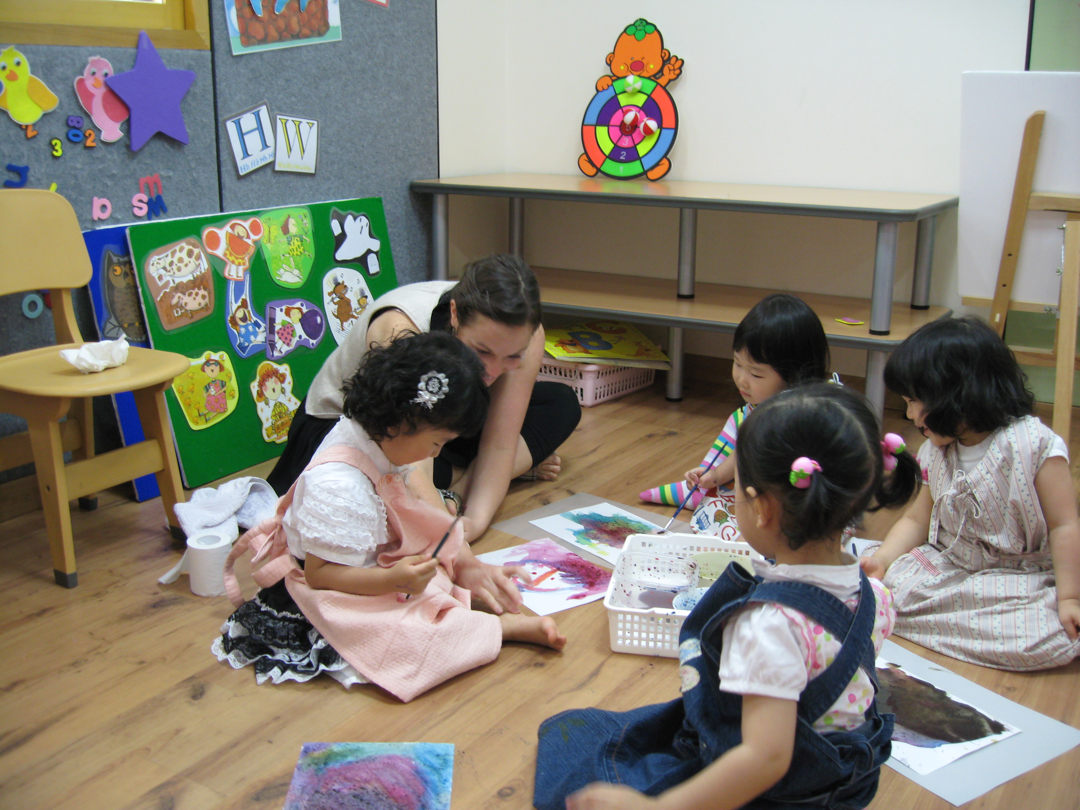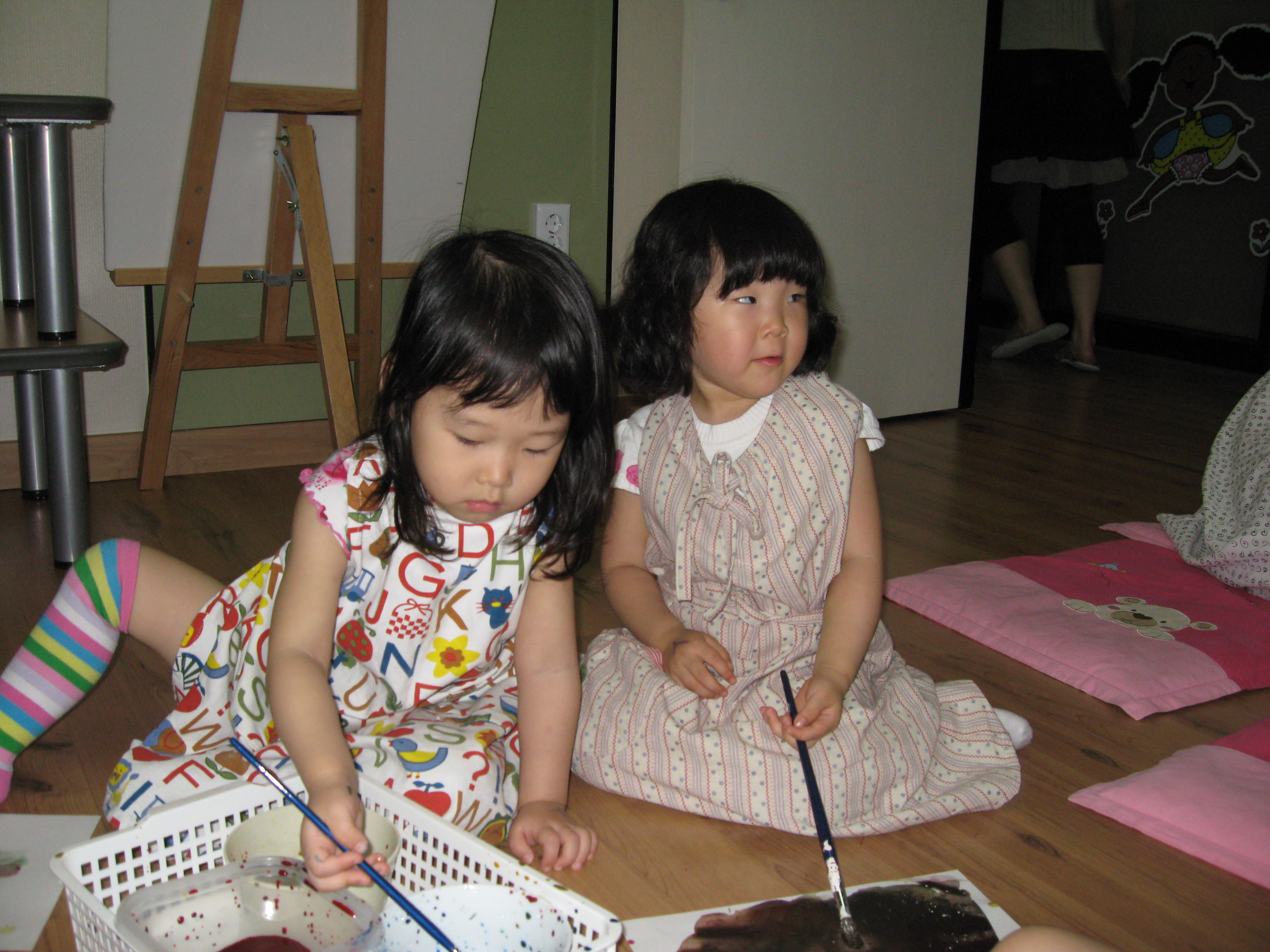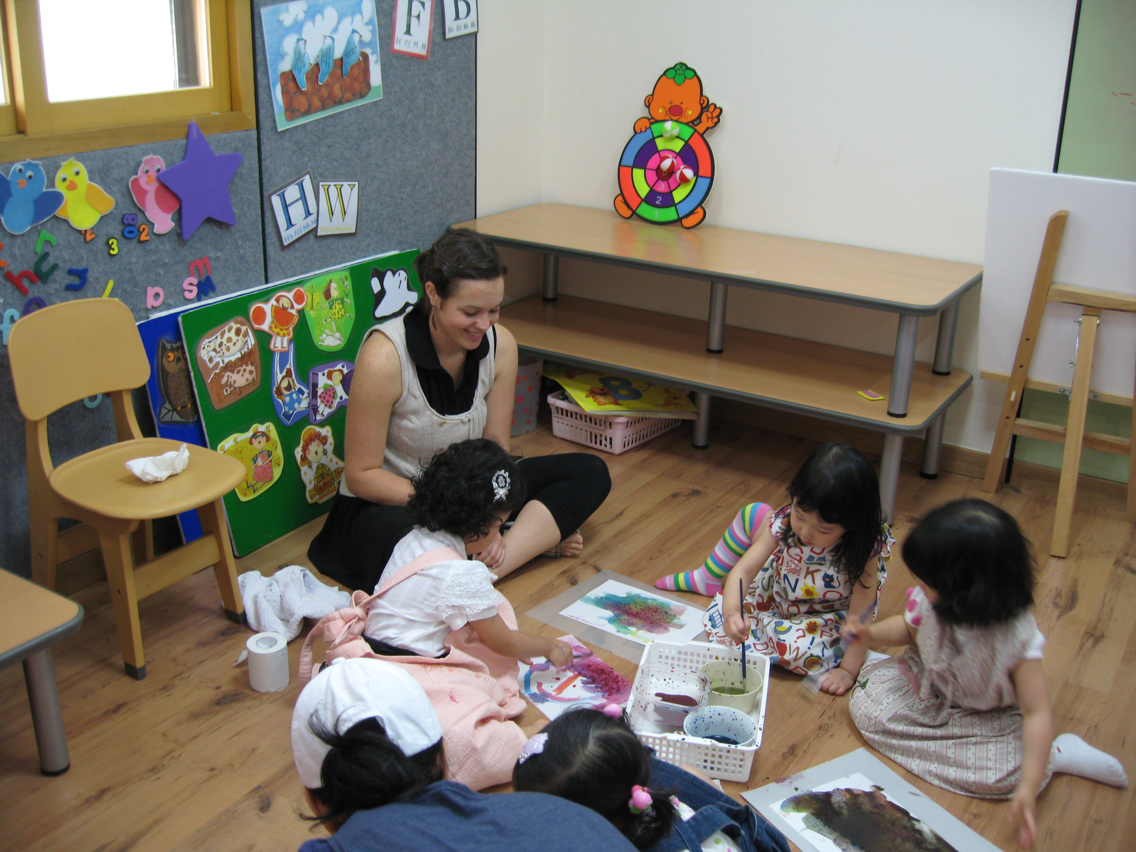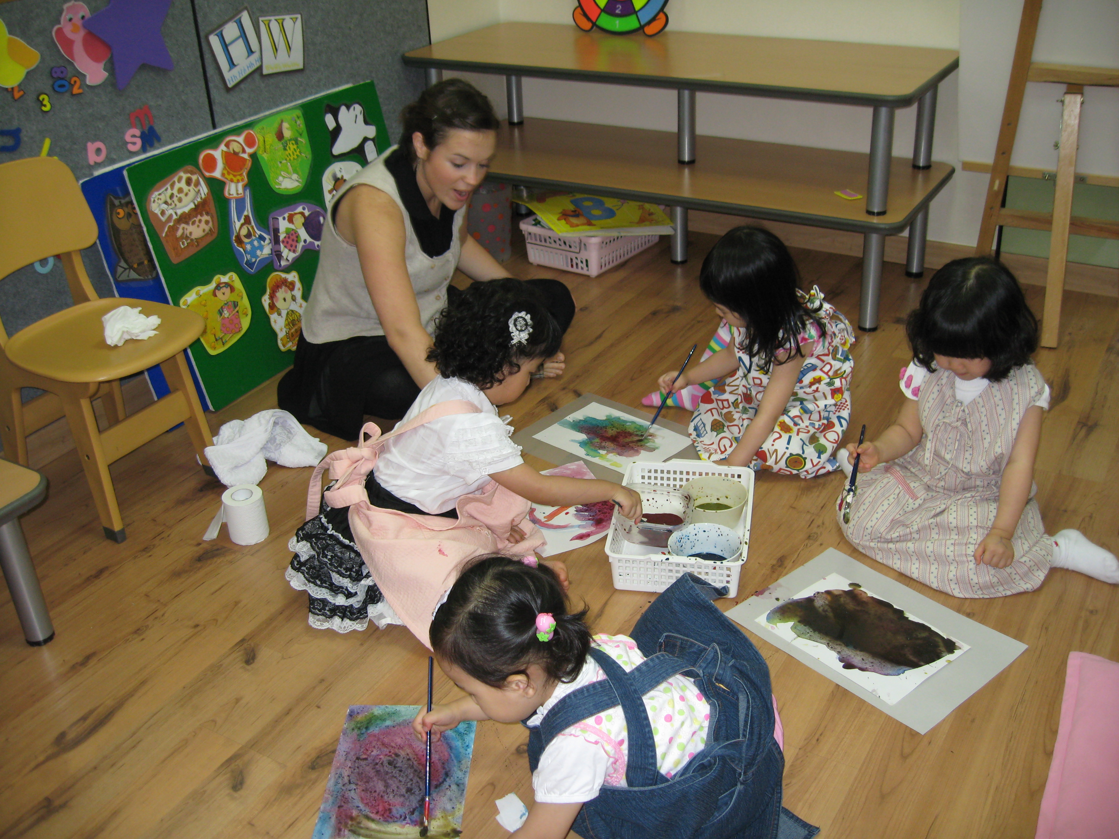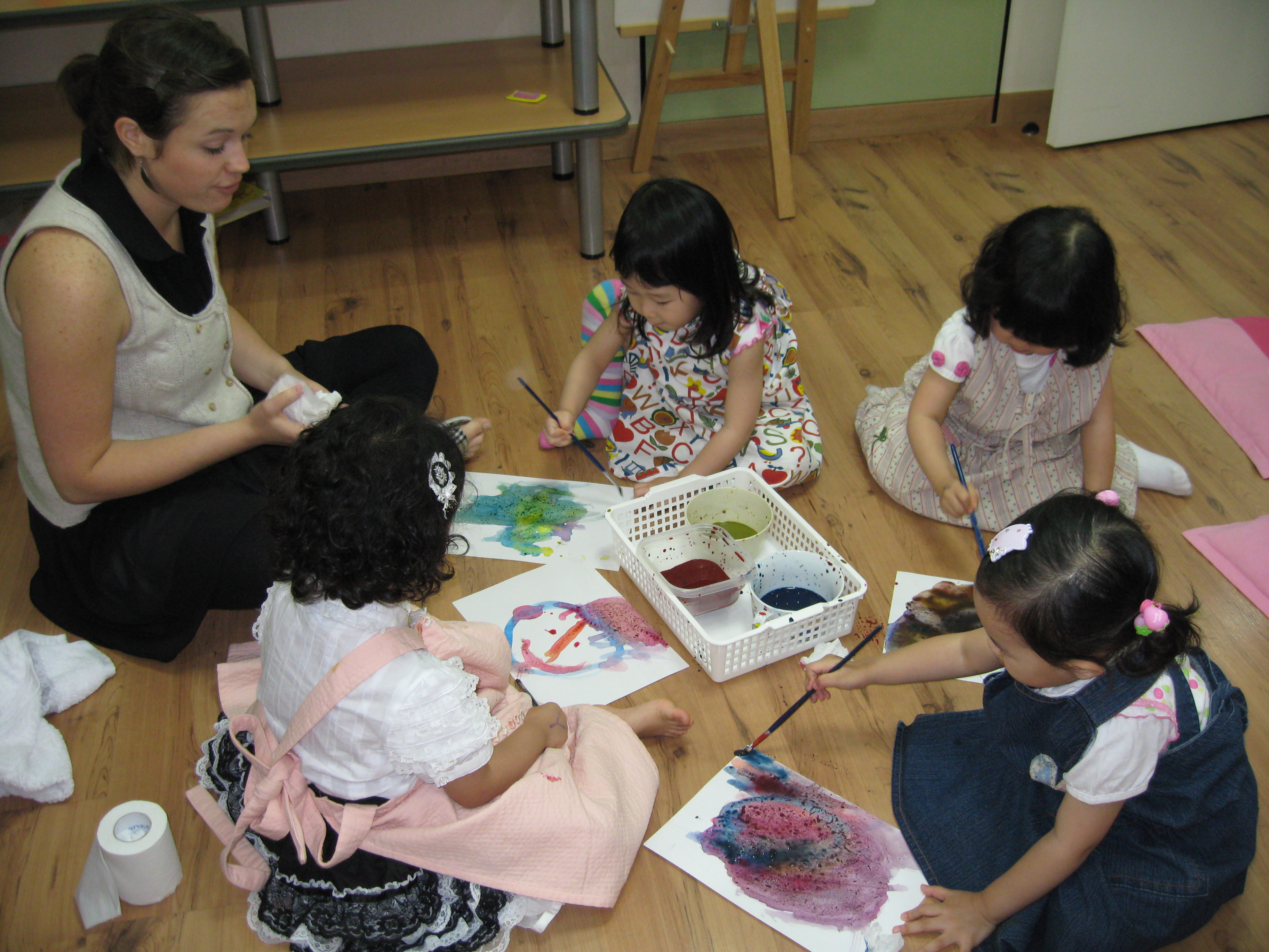 Today we learned more about colors through a book named My Crayons Talk. Blue says "swing so high", Red says "Do not go", Yellow says "Quick, baby chick". We used these colors, blue, red, and yellow, to figure out what other colors we could make like green, orange, purple and brown. Eli made a creative crocodile, pond, and chair. Minji painted a colorful rainbow. Minnie painted a lovely person on a sunny day. Sophia used green and purple to create a beautiful painting!!